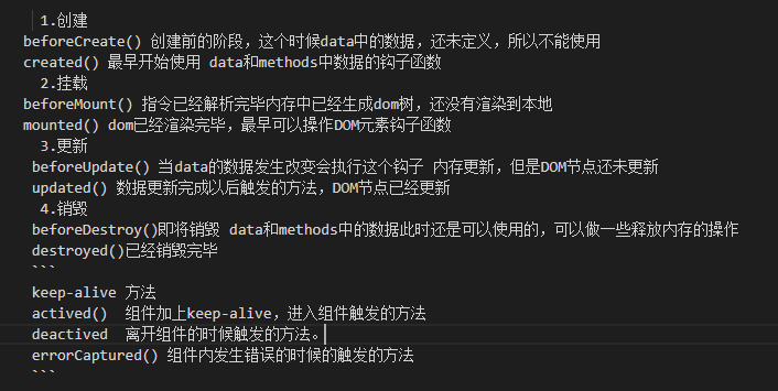 beforecreate: 可以在这加个loading事件,在加载实例时触发created: 初始化完成时的事件写在这里,如在这结束loading事件,异步请求也适宜在这里调用mounted: 挂载元素,获取到DOM节点updated: 如果对数据统一处理,在这里写上相应函数beforeDestroy: 可以清除定时器nextTick: 更新数据后立即操作dom- 在下次 DOM 更新循环结束之后执行延迟回调。在这里里面的代码会等到dom更新以后再执行。